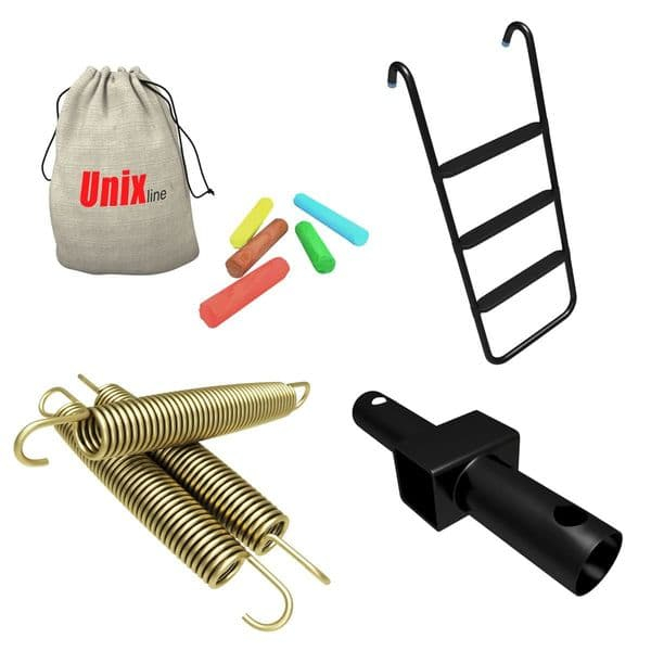 Помимо верхней защитной сетки, все батуты премиального модельного ряда UNIX line оборудованы нижней защитной сеткой, которая препятствует проникновению под прыжковое полотно батута детей, животных, а также попаданию посторонних предметов, и лестницей для удобства пользования. Так же в комплект входят специальные крепления батута к земле (колышки).