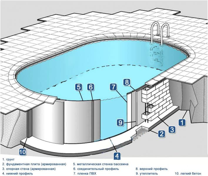 Конструктивно бассейны  выполнены из ламинированной листовой стали толщиной 0,5 мм армированной поперечным профилем и чашкового ПВХ пакета с толщиной стенки 0,4 мм. Многослойный полимерный материал позволяет продлить срок эксплуатации бассейна до 20-25 лет при периодической (раз в 7-10 лет) замены чашкового пакета. Замена чашкового пакета производится без демонтажа бассейна, необходим только доступ к верхней кромке бассейна и технологическим отверстиям.